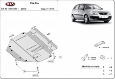 Scut motor Kia Rio - dupa 2005. Acest scut motor vine insotit de elementele de montaj. Scutul protejeaza motorul si cutia de viteze. Scut motor din tabla de otel vopsita electrostatic, prevazut cu intarituri si aerisiri. Acest scut motor se monteaza (la orice service) pe toate motorizarile fie ele benzina sau diesel. Acest scut motor este nou. Pentru mai multe detalii contactati-ne telefonic.