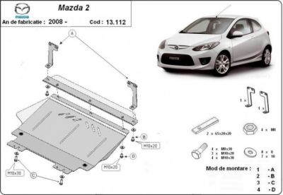 Scut motor Mazda 2. Scutul motor se livreaza impreuna cu kit-ul de montaj. Scut motor care acopera si cutia. Scut motor fabricat din tabla de otel de 2 mm. Pentru rezistenta acest scut motor este prevazut cu intarituri longitudinale si este vopsit electrostatic. Acest scut motor se monteaza pe toate tipurie de motorizare. Montarea acestui scut motor nu implica modificari aduse masinii dvs. Pentru detalii contactati-ne