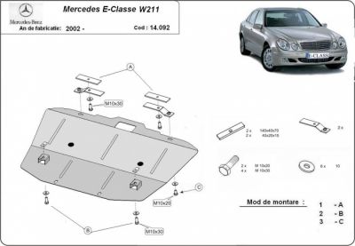 Scut motor Mercedes E Classe dupa 2002. Scutul protejeaza motorul, pentru cutia de viteze exista scut special. Acest scut motor vine insotit de elementele de montaj. Scut motor fabricat din tabla de otel. Acest scut motor se monteaza pe toate modelele si este prevazut cu vizita ptr. schimbul de ulei. Montajul acestui scut motor se poate face oriunde si chiar de dvs. Acest scut motor este nou si este vopsit in camp electrostatic. Pentru mai multe detalii contactati-ne.