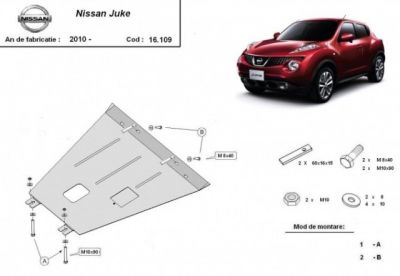 Scut motor metal Nissan Juke. Scutul protejeaza motorul, baia de ulei si cutia de viteze. Scut motor din tabla de otel vopsita electrostatic, prevazut cu intarituri si aerisiri. Acest scut motor vine insotit de elementele de montaj. Acest scut motor se monteaza (la orice service) pe toate motorizarile fie ele benzina sau diesel. Scutul este prevazut si cu 2 protecti laterale din fibra ptr. praf. Acest scut motor este nou. Pentru mai multe detalii contactati-ne telefonic.