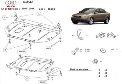 Scut motor metalic Audi A4 1 1995 - 2001. Scutul frontal protejeaza doar motorul. Acest scut motor vine impreuna cu elementele de prindere. Scut motor fabricat din otel cu intarituri si vopsit electrostatic. Acest scut motor se monteaza pe toate tipurile de motorizari in patru cilindrii. Montarea acestui scut motor nu implica modificari aduse masinii dvs. Pentru cutia de viteze este necesar un alt scut metalic.