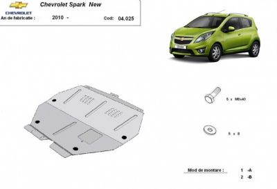 Scut motor metalic Chevrolet Spark - fabricate incepand cu anul 2010. Scut motor metalic ideal ptr. drumuri dificile. Scut motor ce vine insotit de kit complet de montaj. Scutul motor metalic protejeaza motorul si cutia de viteze. Scut motor din tabla de otel vopsita in camp electrostatic, prevazut cu intarituri, aerisiri si vizita.Pentru montarea scutului motor metalic nu sunt necesare modificari ale autoturismului. Acest scut motor metalic se potriveste pe toate motorizarile de Chevrolet Spark fabricat dupa 2010. Acest scut motor este nou. Pentru mai multe detalii contactati-ne telefonic.