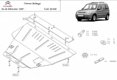 Scut motor metalic Citroen Berlingo produs intre 1997 - 2008. Scut motor metalic ce protejeaza motorul masini. Scutul motor metalic protejeaza si cutia de viteze. Scutul motor metalic este nou si se potriveste perfect pentru toate tipurile de motorizari de Citroen Berlingo 1997-2008. Scutul motor metalic se livreaza impreuna cu kit-ul de montaj iar montarea lui nu afecteaza garantia Scut motor fabricat din tabla de otel. Pentru rezistenta acest scut motor este prevazut cu intarituri longitudinale si este vopsit electrostatic. Montarea acestui scut motor nu implica modificari aduse masinii dvs. Pentru detalii contactati-ne.