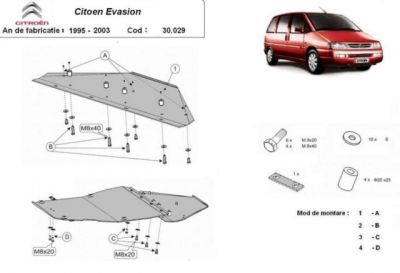 Scut motor metalic Citroen Evasion. Scut motor metalic ce protejeaza motorul si cutia de viteze. Scutul motor metalic este nou si se potriveste perfect pentru toate tipurile de motorizari de Citroen Evasion. Scutul motor se livreaza impreuna cu kit-ul de montaj iar montarea lui nu afecteaza garantia. Scut motor fabricat din tabla otel. Pentru rezistenta acest scut motor este prevazut cu intarituri longitudinale si este vopsit electrostatic. Montarea acestui scut motor nu implica modificari aduse masinii dvs. Pentru detalii contactati-ne.