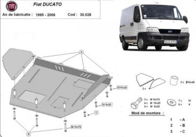 Scut motor metalic Fiat Ducato 1995 - 2006. Acest scut motor metalic este nou si se potriveste perfect pentru toate tipurile de motorizari de Fiat Ducato fabricate incepand cu anul 1995 pana in 2006. Scutul motor metalic protejeaza si cutia de viteze. Se livreaza impreuna cu kit-ul de montaj iar montarea nu afecteaza garantia. Fabricat din tabla otel. Pentru rezistenta acest scut motor este prevazut cu intarituri longitudinale si vopsit electrostatic. Montarea nu implica modificari aduse masinii dvs. Pentru detalii contactati-ne.