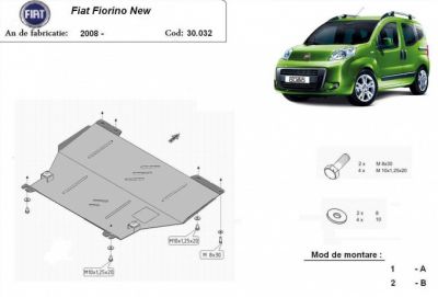 Scut motor metalic Fiat Fiorino dupa 2008. Scut motor metalic ideal ptr. drumuri dificile. Scut motor metalic ce vine insotit de kit complet de montaj. Scutul motor metalic protejeaza motorul si cutia de viteze. Scut motor din tabla de otel vopsita in camp electrostatic, prevazut cu intarituri, aerisiri si vizita. Pentru montarea scutului motor metalic nu sunt necesare modificari ale autoturismului. Acest scut motor metalic se potriveste pe toate motorizarile de Fiat Fiorino 1 fabricat dupa 2008. Acest scut motor este nou. Pentru mai multe detalii contactati-ne telefonic.