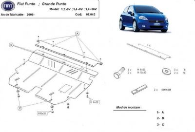 Scut motor metalic Fiat Grande Punto (fabr. dupa 2006). Scut motor metalic ideal ptr. drumuri dificile. Scut motor metalic ce vine insotit de kit complet de montaj. Scutul motor metalic protejeaza motorul si cutia de viteze. Scut motor din tabla de otel vopsita in camp electrostatic, prevazut cu intarituri, aerisiri si vizita. Pentru montarea scutului motor metalic nu sunt necesare modificari ale autoturismului. Acest scut motor metalic se potriveste pe toate motorizarile de Fiat Grande Punto fabricat dupa 2006. Acest scut motor este nou. Pentru mai multe detalii contactati-ne telefonic.
