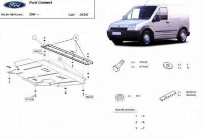 Scut motor metalic Ford Connect produs dupa 2004. Acest scut motor metalic este nou si se potriveste perfect pentru toate tipurile de motorizari de Ford Connect dupa 2004. Scutul motor metalic protejeaza si cutia de viteze. Acest scut motor metalic se potriveste pe toate motorizarile (benzina si diesel). Scutul motor se livreaza impreuna cu kit-ul de montaj iar montarea lui nu afecteaza garantia. Scut motor fabricat din tabla de otel. Pentru rezistenta acest scut motor este prevazut cu intarituri longitudinale si este vopsit electrostatic. Montarea acestui scut motor nu implica modificari aduse masinii dvs. Pentru detalii contactati-ne.