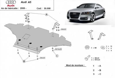 Scut motor metalic frontal Audi A5 facut dupa 2008. Scut motor metalic ce protejeaza motorul masinii. Acest scut motor este nou si se potriveste pe toate motorizarile (benzina si diesel). Scutul motor se livreaza impreuna cu kit-ul de montaj iar montarea lui nu afecteaza garantia. Pentru cutia de viteze este necesara achizitionarea unui scut metalic suplimentar. Scut motor fabricat din tabla de otel. Pentru rezistenta acest scut motor este prevazut cu intarituri longitudinale si este vopsit electrostatic. Montarea acestui scut motor nu implica modificari aduse masinii dvs. Pentru detalii contactati-ne.