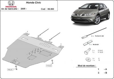 Scut motor metalic Honda Civic realizat dupa 2005. Scut motor metalic ce protejeaza motorul masinii dar si cutia de viteze. Scutul motor metalic este nou si se potriveste perfect pentru toate tipurile de motorizari de Honda Civic fabricate dupa 2005. Scutul motor se livreaza impreuna cu kit-ul de montaj iar montarea lui nu afecteaza garantia. Scut motor fabricat din tabla de otel. Pentru rezistenta acest scut motor este prevazut cu intarituri longitudinale si este vopsit electrostatic. Montarea acestui scut motor nu implica modificari aduse masinii dvs. Pentru detalii contactati-ne.