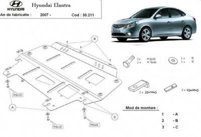 Scut motor metalic Hyundai Elantra. Acest scut motor metalic este nou si se potriveste perfect pentru toate tipurile de motorizari de Hyundai Elantra. Scut motor metalic ce protejeaza si cutia de viteze. Acest scut motor metalic se potriveste pe toate motorizarile (benzina si diesel). Scut motor ce se livreaza impreuna cu kit-ul de montaj iar montarea lui nu afecteaza garantia. Scut motor fabricat din tabla de otel. Pentru rezistenta acest scut motor este prevazut cu intarituri longitudinale si este vopsit electrostatic. Montarea acestui scut motor nu implica modificari aduse masinii dvs. Pentru detalii contactati-ne.