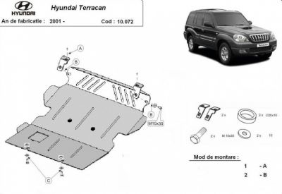 Scut motor metalic Hyundai Terracan. Scut motor metalic ce protejeaza motorul masini. Scut motor metalic ce protejeaza si cutia de viteze.pentru diferential este necesar un alt scut metalic. Scut motor metalic nou, se potriveste perfect pentru toate tipurile de motorizari de Hyundai Terracan. Scut motor metalic ce se livreaza impreuna cu kit-ul de montaj iar montarea lui nu afecteaza garantia. Scut motor fabricat din tabla de otel. Pentru rezistenta acest scut motor este prevazut cu intarituri longitudinale si este vopsit electrostatic. Montarea acestui scut motor nu implica modificari aduse masinii dvs. Pentru detalii contactati-ne.