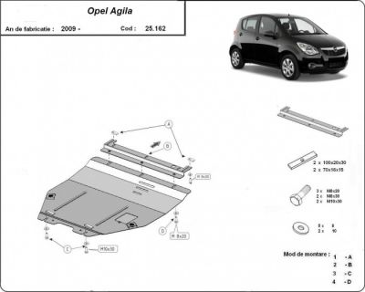 Scut motor metalic Opel Agila modele dupa 2009. Acest scut motor metalic este nou si se potriveste perfect pentru toate tipurile de motorizari de Opel Agila dupa 2009. Scut motor metalic ce protejeaza si cutia de viteze. Acest scut motor metalic se potriveste pe toate motorizarile (benzina si diesel). Scut motor ce se livreaza impreuna cu kit-ul de montaj iar montarea lui nu afecteaza garantia. Scut motor fabricat din tabla de otel. Pentru rezistenta acest scut motor este prevazut cu intarituri longitudinale si este vopsit electrostatic. Montarea acestui scut motor nu implica modificari aduse masinii dvs. Pentru detalii contactati-ne.