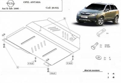 Scut motor metalic Opel Antara dupa 2006. Acest scut motor metalic este nou si se potriveste perfect pentru toate tipurile de motorizari de Opel Antara dupa 2006. Scut motor metalic ce protejeaza si cutia de viteze. Acest scut motor metalic se potriveste pe toate motorizarile (benzina si diesel). Scut motor ce se livreaza impreuna cu kit-ul de montaj iar montarea lui nu afecteaza garantia. Scut motor fabricat din tabla de otel. Pentru rezistenta acest scut motor este prevazut cu intarituri longitudinale si este vopsit electrostatic. Montarea acestui scut motor nu implica modificari aduse masinii dvs. Pentru detalii contactati-ne.