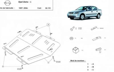 Scut motor metalic Opel Astra G realizat nou. Acest scut motor metalic este nou si se potriveste perfect pentru toate tipurile de motorizari de Opel Astra G. Scut motor ce protejeaza si cutia de viteze. Scut motor ce se livreaza impreuna cu kit-ul de montaj iar montarea lui nu afecteaza garantia. Scut motor fabricat din tabla de otel. Pentru rezistenta acest scut motor este prevazut cu intarituri longitudinale si este vopsit electrostatic. Montarea acestui scut motor nu implica modificari aduse masinii dvs. Pentru detalii contactati-ne.