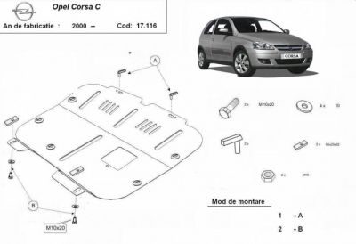 Scut motor metalic Opel Corsa C realizat nou. Scut motor metalic si cutie de viteze ideal ptr. drumuri dificile. Scut motor metalic ce vine insotit de kit complet de montaj. Scut motor din tabla de otel vopsita in camp electrostatic, prevazut cu intarituri, aerisiri si vizita. Pentru montarea acestui scut motor metalic nu sunt necesare modificari ale autoturismului. Acest scut motor metalic se potriveste pe toate motorizarile de Opel Corsa C. Acest scut motor este nou. Pentru mai multe detalii contactati-ne telefonic.