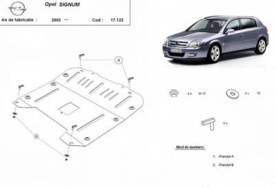 Scut motor metalic Opel Signum realizat dupa 2002. Scut motor metalic ce protejeaza motorul masini si cutia de viteze. Scut motor metalic nou, se potriveste perfect pentru toate tipurile de motorizari de Opel Signum dupa 2002. Scut motor metalic ce se livreaza impreuna cu kit-ul de montaj iar montarea lui nu afecteaza garantia. Scut motor fabricat din tabla de otel. Pentru rezistenta acest scut motor este prevazut cu intarituri longitudinale si este vopsit electrostatic. Montarea acestui scut motor nu implica modificari aduse masinii dvs. Pentru detalii contactati-ne.