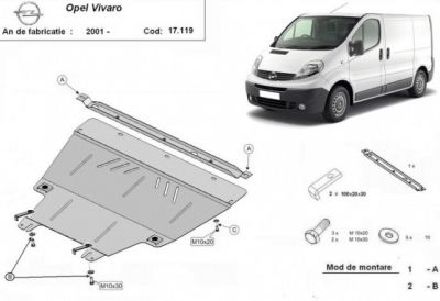 Scut motor metalic Opel Vivaro dupa 2001. Acest scut motor metalic este nou si se potriveste perfect pentru toate tipurile de motorizari de Opel Vivaro dupa 2001. Scutul motor metalic protejeaza si cutia de viteze. Acest scut motor se potriveste pe toate motorizarile. Scutul motor se livreaza impreuna cu kit-ul de montaj iar montarea lui nu afecteaza garantia. Fabricat din tabla de otel. Pentru rezistenta acest scut motor este prevazut cu intarituri longitudinale si este vopsit electrostatic. Montarea nu implica modificari aduse masinii dvs. Pentru detalii contactati-ne.