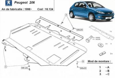 Scut motor metalic Peugeot 206 produs nou. Acest scut motor metalic este nou si se potriveste perfect pentru toate tipurile de motorizari de Peugeot 206. Scut motor metalic ce protejeaza si cutia de viteze. Acest scut motor metalic se potriveste pe toate motorizarile (benzina si diesel). Scut motor ce se livreaza impreuna cu kit-ul de montaj iar montarea lui nu afecteaza garantia. Scut motor fabricat din tabla de otel. Pentru rezistenta acest scut motor este prevazut cu intarituri longitudinale si este vopsit electrostatic. Montarea acestui scut motor nu implica modificari aduse masinii dvs. Pentru detalii contactati-ne.