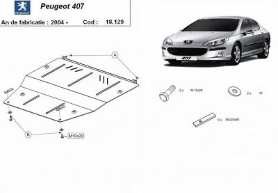 Scut motor metalic Peugeot 407 realizat nou. Acest scut motor metalic este nou si se potriveste perfect pentru toate tipurile de motorizari de Peugeot 407. Scut motor ce protejeaza si cutia de viteze. Scut motor ce se livreaza impreuna cu kit-ul de montaj iar montarea lui nu afecteaza garantia. Scut motor fabricat din tabla de otel. Pentru rezistenta acest scut motor este prevazut cu intarituri longitudinale si este vopsit electrostatic. Montarea acestui scut motor nu implica modificari aduse masinii dvs. Pentru detalii contactati-ne.