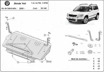 Scut motor metalic Skoda Yeti dupa 2009. Scut motor metalic si cutie de viteze ideal ptr. drumuri dificile. Scut motor metalic ce vine insotit de kit complet de montaj. Scut motor din tabla de otel vopsita in camp electrostatic, prevazut cu intarituri, aerisiri si vizita. Pentru montarea acestui scut motor metalic nu sunt necesare modificari ale autoturismului. Acest scut motor metalic se potriveste pe toate motorizarile de Skoda Yeti dupa 2009 . Acest scut motor este nou. Pentru mai multe detalii contactati-ne telefonic.