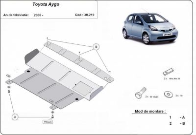 Scut motor metalic Toyota Aygo realizat dupa 2006. Acest scut motor metalic este nou si se potriveste perfect pentru toate tipurile de motorizari de Toyota Aygo dupa 2006. Scut motor ce protejeaza si cutia de viteze. Scut motor ce se livreaza impreuna cu kit-ul de montaj iar montarea lui nu afecteaza garantia. Scut motor fabricat din tabla de otel. Pentru rezistenta acest scut motor este prevazut cu intarituri longitudinale si este vopsit electrostatic. Montarea acestui scut motor nu implica modificari aduse masinii dvs. Pentru detalii contactati-ne.