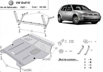 Scut motor metalic VW Golf 4 realizat 1997 - 2004. Acest scut motor metalic este nou si se potriveste perfect pentru toate tipurile de motorizari de VW Golf 4 fabricate incepand cu 1997 pana in 2004.Scutul motor metalic protejeaza si cutia de viteze. Acest scut motor se potriveste pe toate motorizarile (benzina si diesel). Scutul motor se livreaza impreuna cu kit-ul de montaj iar montarea lui nu afecteaza garantia. Scut motor fabricat din tabla de otel. Pentru rezistenta acest scut motor este prevazut cu intarituri longitudinale si este vopsit electrostatic. Montarea acestui scut motor nu implica modificari aduse masinii dvs. Pentru detalii contactati-ne.