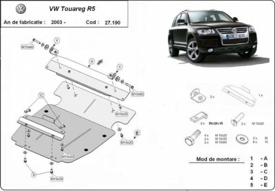 Scut motor metalic VW Touareg R5 realizat dupa 2003. Scut motor metalic si cutie de viteze ideal ptr. drumuri dificile. Scut motor metalic ce vine insotit de kit complet de montaj. Scut motor din tabla de otel vopsita in camp electrostatic, prevazut cu intarituri, aerisiri si vizita. Pentru montarea acestui scut motor metalic nu sunt necesare modificari ale autoturismului. Acest scut motor metalic se potriveste pe toate motorizarile de VW Touareg R5 dupa 2003. Acest scut motor este nou. Pentru mai multe detalii contactati-ne telefonic.