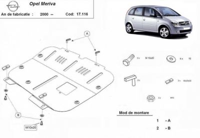 Scut motor Opel Meriva A dupa 2000. Scut motor metalic cu intarituri si aerisiri. Scut protejeaza motorul si cutia de viteze. Ptr. schimbul de ulei exista vizita speciala. Acest scut motor vine insotit de kit-ul de montaj si schita aferenta. Acest scut motor se poate monta pe toate motorizarile. Prinderea se face pe puntea fata si pe lonjeron. Scutul este nou si se livreaza prin curier rapid. Pentru mai multe detalii contactati-ne.