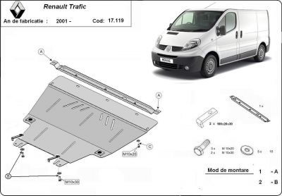 Scut motor otel Renault Master 2001 - prezent. Scut motor ce protejeaza si cutia de viteze. Scut motor metalic cu armaturi, aerisiri si vizita ptr. schimbul de ulei. Scutul motor vine impreuna cu kit de montaj si schita. Acest scut motor se potriveste perfect pe toate motorizarile. Montarea scutului motor se face fara a aduce modificari masinii dumneavoastra. Pentru mai multe detalii contactati-ne.