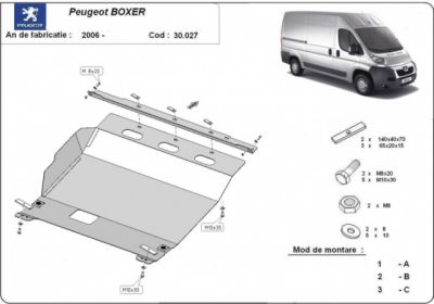 Scut motor Peugeot Boxer model dupa 2006. Scutul protejeaza motorul si cutia de viteze. Acest scut motor vine impreuna cu elementele de prindere. Scut motor fabricat din otel cu intarituri si vopsit electrostatic. Acest scut motor se monteaza pe toate tipurie de motorizare. Montarea acestui scut motor nu implica modificari aduse masinii dvs. Pentru detalii contactati-ne