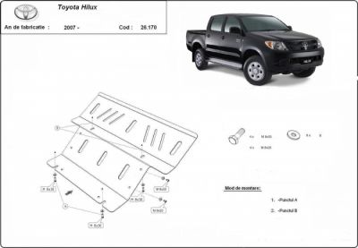 Scut motor si cutie de viteze metalic Toyota Hilux realizat dupa 2007. Acest scut motor metalic este nou si se potriveste perfect pentru toate tipurile de motorizari de Toyota Hilux dupa 2007. Scut motor ce protejeaza si cutia de viteze.Pentru diferential este nevoie de un scut metalic suplimentar. Scut motor ce se livreaza impreuna cu kit-ul de montaj iar montarea lui nu afecteaza garantia. Scut motor fabricat din tabla de otel. Pentru rezistenta acest scut motor este prevazut cu intarituri longitudinale si este vopsit electrostatic. Montarea acestui scut motor nu implica modificari aduse masinii dvs. Pentru detalii contactati-ne.