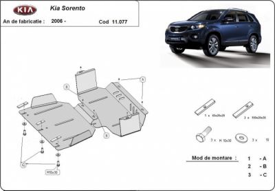 Scut motor si radiator metalic Kia Sorento realizat dupa 2006. Scut motor metalic ideal ptr. drumuri dificile. Scut motor metalic ce vine insotit de kit complet de montaj. Scut motor din tabla de otel vopsita in camp electrostatic, prevazut cu intarituri, aerisiri si vizita. Pentru montarea acestui scut motor metalic nu sunt necesare modificari ale autoturismului. Acest scut motor metalic se potriveste pe toate motorizarile de Kia Sorento dupa 2006. Acest scut motor este nou. Pentru mai multe detalii contactati-ne telefonic.