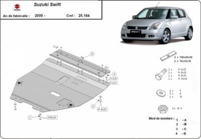 Scut motor Suzuki Swift (modele dupa 2005). Scut motor care acopera si cutia. Acest scut motor se livreaza cu tot cu kit-ul de montaj. Scut motor fabricat din tabla de otel de 2 mm. Pentru rezistenta acest scut motor este prevazut cu intarituri longitudinale si este vopsit electrostatic. Acest scut motor se monteaza pe toate tipurie de motorizare. Montarea acestui scut motor nu implica modificari aduse masinii dvs. Pentru detalii contactati-ne