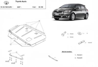 Scut motor metalic Toyota Auris (fabr. dupa 2007). Acest scut motor metalic este nou si se potriveste perfect pentru toate tipurile de motorizari de Toyota Auris fabricate dupa 2007. Scutul motor metalic protejeaza si cutia de viteze. Acest scut motor se potriveste pe toate motorizarile. Scutul motor se livreaza impreuna cu kit-ul de montaj iar montarea lui nu afecteaza garantia. Fabricat din tabla de otel. Pentru rezistenta acest scut motor este prevazut cu intarituri longitudinale si este vopsit electrostatic. Montarea acestui scut motor nu implica modificari aduse masinii dvs. Pentru detalii contactati-ne.