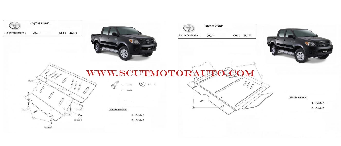 Set scuturi metalice pentru motor si radiator dedicate pentru Toyota Hilux generatia aparuta in 2005 modelele AN10 si AN20. Scuturile sunt farbicate din tabla de otel de 3 mm cu intarituri longitudinale. Totodata sunt vopsite in camp electrostatic.