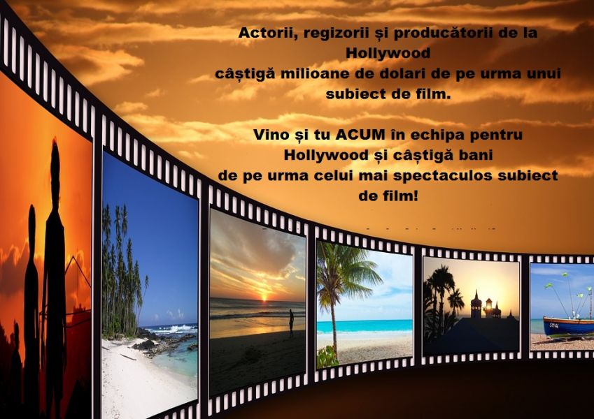 Ne extindem spre Hollywood! Cāștigă bani cu un subiect de film! Vino și tu acum īn echipa noastră pentru Hollywood! Oferta: primeşti instrucţiuni complete, semnezi contract de comision, beneficiezi de pregătire gratuită si de suportul echipei pe tot parcursul activității, scrisoare de recomandare pt. cei cu rezultate concrete, program flexibil (1-2ore/zi).