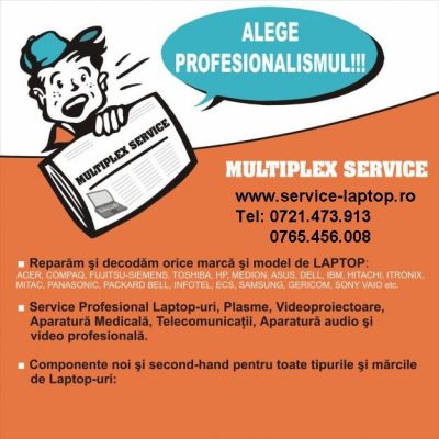 - Service Laptop-uri, Plasme, Videoproiectoare, Aparatura Medicala, Telecomunicatii, Aparatura audio si video profesionala.Reparam si decodam, orice marca si model de laptop : Acer,Compaq,Fujitsu-Siemens,Toshiba,Hp,Asus,Dell,Ibm, Hitachi,Itronix,Mitac,Panasonic,Packard Bell,Infotel,Ecs,Samsung,Lg,Gericom,Medion,Sony Vaio etc. Nu stii la cine sa apelezi? Apeleaza-ne cu toata increderea! Noi suntem solutia !!! 0721473913 w w w.service-laptop.ro