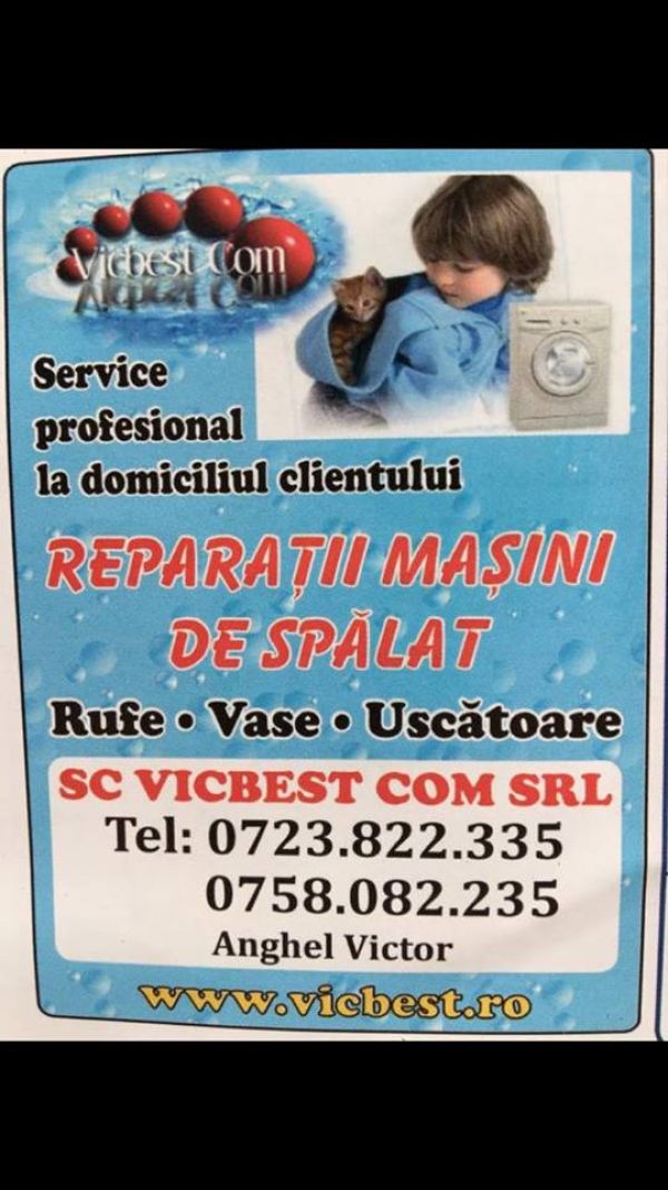 Firma SC Vicbest Com SRL va ofera SERVICE PROFESIONAL la orice model de masina de spalat rufe, masina de spalat vase si uscatoare de rufe, in BUCURESTI, toate sectoarele, Ilfov, OTOPENI, Mogosoaia, Buftea, Tunari, Dimieni, Balotesti, Corbeanca, Paradisul Verde, Saftica , Snagov ,s.a. , la domiciliu dumneavoastra. Utilizam piese noi din stoc si putem comanda piese direct de la depozitul central pe tara, la cele mai mici preturi de pe piata, originale si alternative.