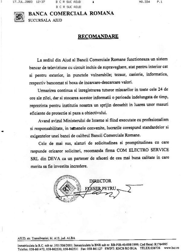 S.C.COM ELECTRO SERVICE SRL DEVA va sta la dispozitie cu servicii de proiectare,montaj si mentenanta ,solutii si sisteme de calitate superioara la cel mai bun raport calitate/pret de pe piata!Societatea noastra detine toate licentele si avizele necesare proiectarii,montajului si mentenantei sistemelor de alarmare la efractie,incendiu,supraveghere video,control acce,interfonie si videointerfonie.Detinem un numar de 12 angajati cu vechime de peste 20 de ani in domeniu,licentiati MIRA si IGSU,dotati cu mjloace tehnice necesare pentru ducerea la indeplinire a celor mai complexe sarcini in domeniu.