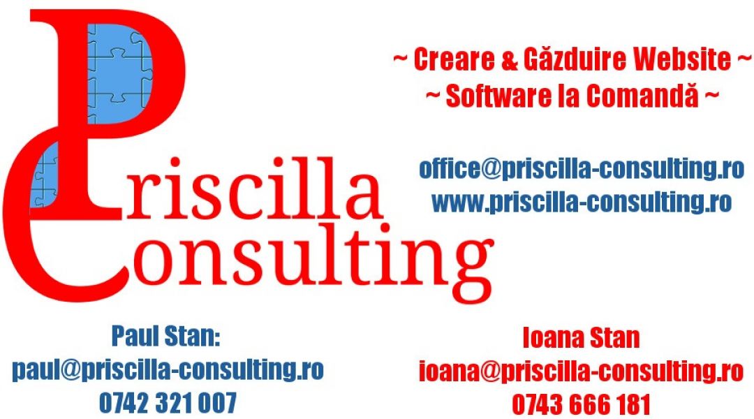 - Priscilla Consulting realizeaza site de prezentare gratuit, la incheierea unui contract de 50 Ron/luna, timp de un an, tarif ce include mentenanta si hosting-ul site-ului. Inf tel 0743 666181. www.priscilla-consulting.ro