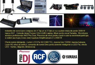 Consola Pioneer Cdj 400+DJM 350, 4 top- uri RCF si 2 subbwofere 18(putere totala peste 3200 W/ RMS), Rack 19 dotat cu mixer Yamaha 12 intrari , puterile aferente, procesor de voce , crossover, Eq. Microfoane fara fir AKG Pro - 2 buc