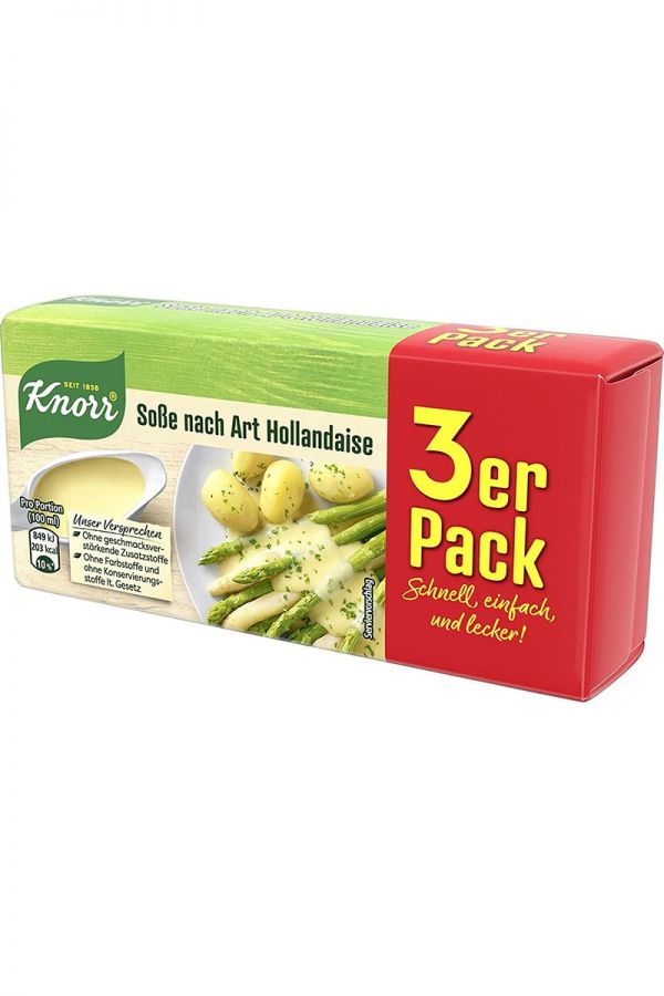 Total Blue comercializeaza din stoc sos Hollandaise pentru legume de la Knorr 250 de grame, productie Germania. Sosul Hollandaise sau olandez e o combinatie perfecta de unt, galbenusuri de ou, otet plus condimente dupa gust, cu o consistenta similara maionezei. Import Germania, sosul Hollandaise de la Knorr are un gust foarte fin si se potriveste de minune cu legumele posate si diferite mancaruri ce contin carne. Descopera sosul olandez oferit de Knorr in cantitate de 250 de grame si profita de un produs din ingrediente atent selectionate.