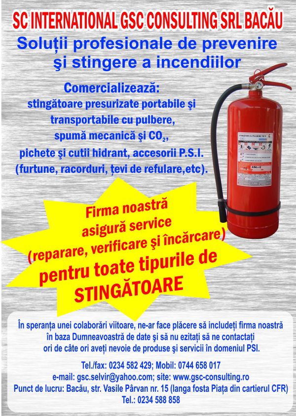 GSC Bacau comercializeaza stingatoare presurizate portabile si transportabile cu pulbere, spuma mecanica si CO2, pichete si cutii hidrant, accesorii P.S.I. (Furtune, racorduri, tevi de refulare) precum si instalatii de stins incendii.