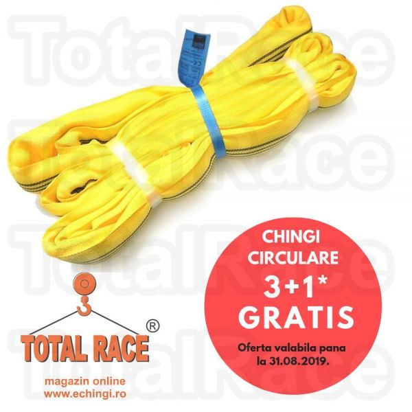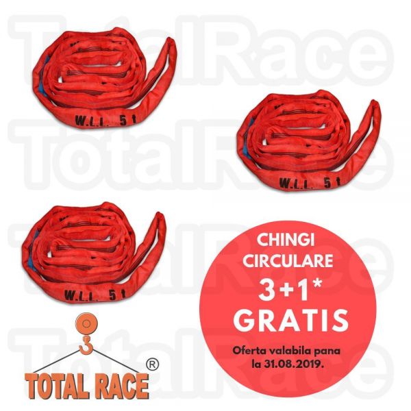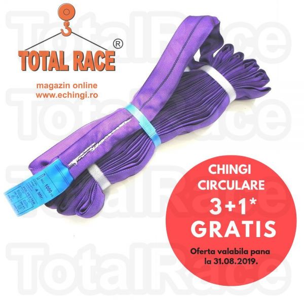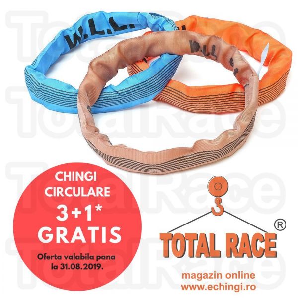 Comanda acum chingi de ridicare circulare si beneficiaza de oferta verii: la achizitia a 3 chingi de ridicare circulare, model TE sau TLX primesti o chinga gratis.Chingile textile circulare sunt disponibile din stoc Bucuresti si au capacitati de ridicare cuprinse intre 1 tona si 10 tone iar lungimi intre 1 metru si 6 metri. Total Race Romania livreaza chingile/sufele de ridicare textile insotite de Declaratie de Conformitate, tabel de sarcini si instructiuni de utilizare.