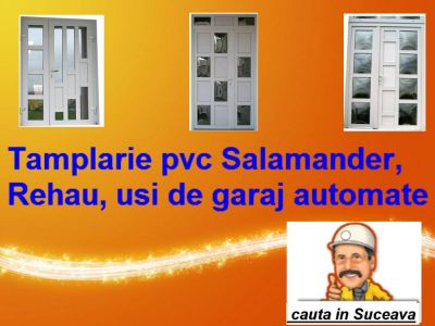 Comercializam tamplarie pvc SALAMANDER STREAMLINE/BLUE EVOLUTION cu feronerie ROTO-NT si sticla de la GUARDIAN ; REHAU CU 3,5,6 CAMERE , feronerie ROTO-NT, usi de garaj sectionale cu telecomanda , rulouri de aluminiu , jaluzele verticale si orizontale, rulouri textile si alte accesorii de tamplarie.