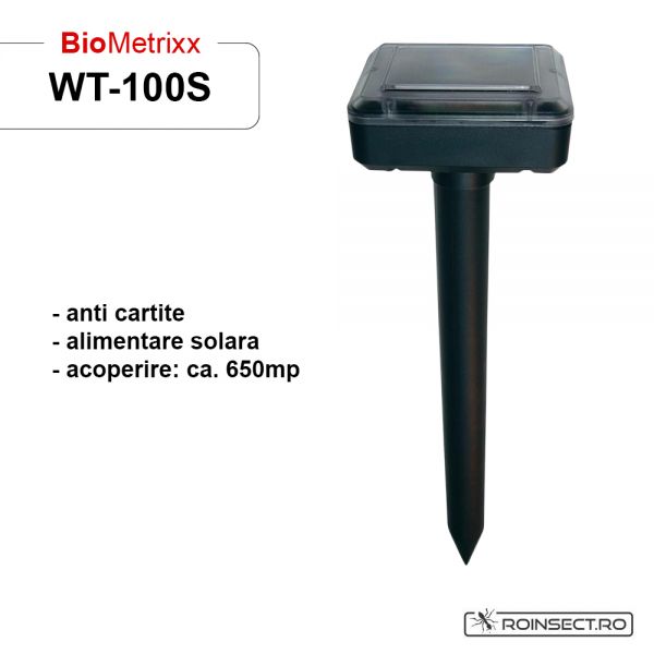 - Aparatul solar BiometrixxWT100S este un dispozitiv electronic care se bazeaza pe puterea sunetelor propagate in pamant si te ajuta sa scapi de daunatorii subterani.Ne puteti contacta la nr de telefon: 0758101503 sau http://www.roinsect.ro/pesticid/aparat-solar-anti-cartita-biometrixx-wt-100s-acopera-650-mp-/993