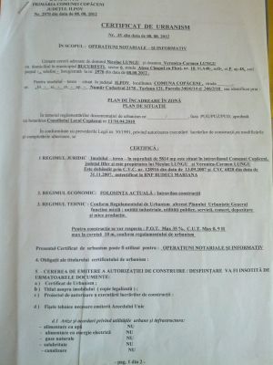 - Particular Vând Teren Zona 1Decembrie in Localitatea Copaceni Judeţ Ilfov intravilan prin P.U.G.5814mp-d=30m.lotizat in 650mp-d=22;drum acces 7.5m teren dubla deschidere Destinatie Mixta(C-ţii civile si industriale).Gaze,curent,la.200m(linie case comuna)Certificat Urbanism-P.O.T.=35% C.U.T.=0,9H max(la cornisa)=10m.Cadastru Intabulare.In viitorul apropiat va fi finalizata constructia.Port.1Decembrie(Canal-Dunare Bucuresti)cu ecluza in Copaceni.Localitatea Copaceni nu este Adunatii Copaceni,sunt comune granita(vecine)difera judetele.Teren plat cu denumire de strada si oficiu postal pt.fiecare lot in parte-str.Bradului nr.60.Accesul la teren se face prin Str.Nucului.Asigur curentul electric la teren.Accept variante cu vila in ilfov.BCA,CARAMIDA,AMVIC(la cheie.200mp)ofer 4000mp.teren.Constructie vila:BCA,CARAMIDA,AMVIC pe terenul meu,ofer.maxim 3000mp.teren.Prin acest gen de teren cu Functiune.Mixta pot fi atrase Fonduri.diferite activitati.Pret 17.euro.Accept plata rate.Tel.0761329671