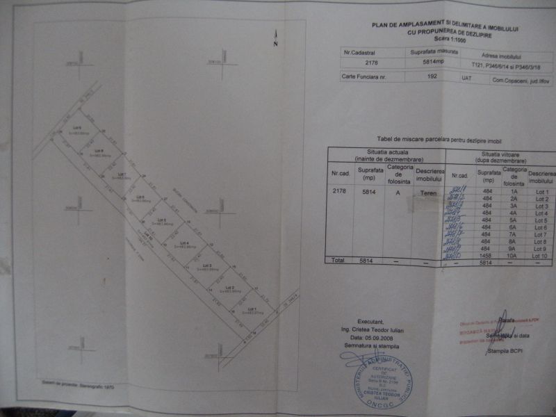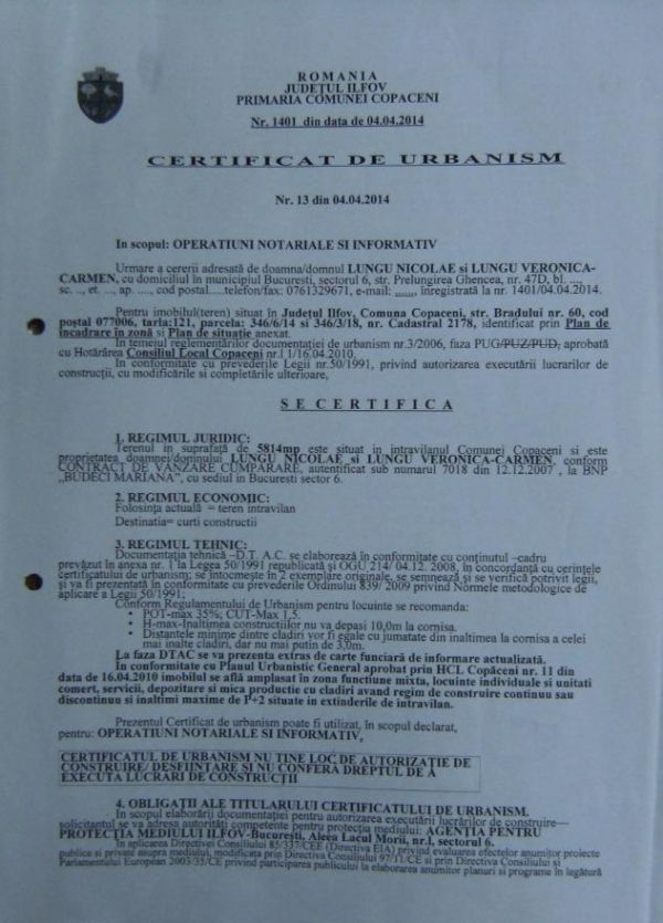 - Proprietar Vand Teren zona 1Decembrie in Localitatea Copaceni Judetul Ilfov Intravilan prin P.U.G.5814mp deschidere compacta 30m lotizat-in loturi de 646mp cu o deschidere pt.fiecare lot.22m cu drum de acces la loturi care este din propriul teren lat de 7.5m totodata acesta conexeaza doua planuri avand deschidere la ambele capete drum.Conf.Cert.Urbanism este Destinatie Mixta atat pt.C-tii.civile dar si pt.Industriale fiind util pt.Case,vile dar si pt.Hale,depozite,ateliere de productie,samd.Utilitati la 200m la linia caselor.Certificat Urbanism.P.O.T.35% C.U.T.0,9h.max(la cornisa)10m.Cadastru si intabulare.Copaceni nu este Adunatii Copaceni,sunt localitati diferite cu judet diferit.Teren plat cu denumire de strada si numar postal pt.toate loturile,locatie in Str.Bradului nr.60.Accesul la teren se face pe asfalt prin Str.Nucului latime 12m ulterior drumul este pietruit.Lot 2 si Lot 9 sunt date.Tel.0761329671,0725065443