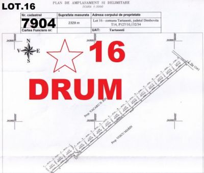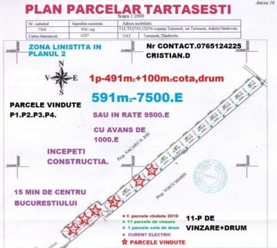 - Vind parcele ieftine Tartasesti jud, Dambovita la cel mai mic pret din zona, intraviran curti constructii puz, p+2. P-591 m2-7500 euro,daca doriti in rate suma este de 9500e. CURENT, GAZE LA 50m Cu un avans de numai 1500e puteti incepe casa mult dorita.nu percep dobinda,garantii etc. ACTELE SUNT IN REGULA, DUREAZA 7 ZILE.,7500 Euro